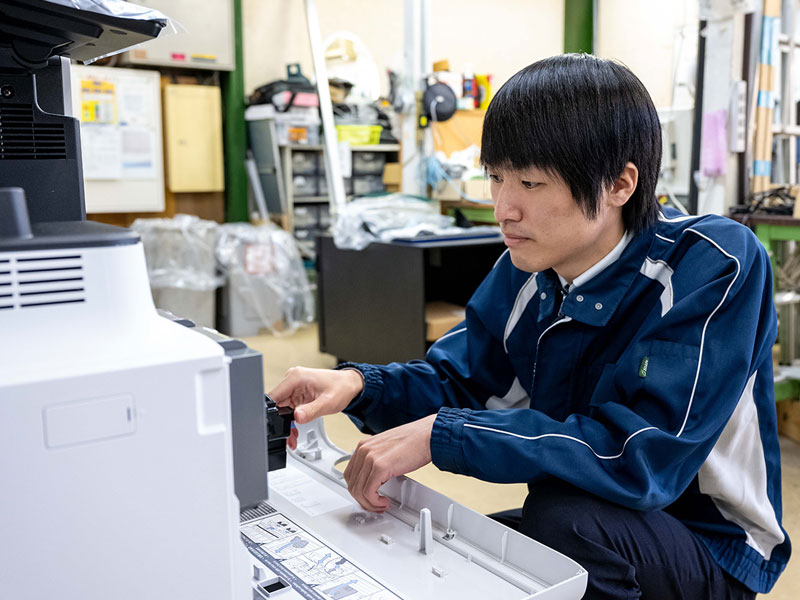高校を卒業したばかりで、右も左もわからない自分を、気さくな先輩が社会人のマナーから複合機に関する基本などを一から教えてくれました。お客さまとどう接していいか、機械はどんな仕組みなのか、約半年間みっちり先輩に同行して学ぶことができて、作業の段取りや効率的なやり方が身に着きました。わからないことや困ったときに、先輩に聞きやすい環境です。